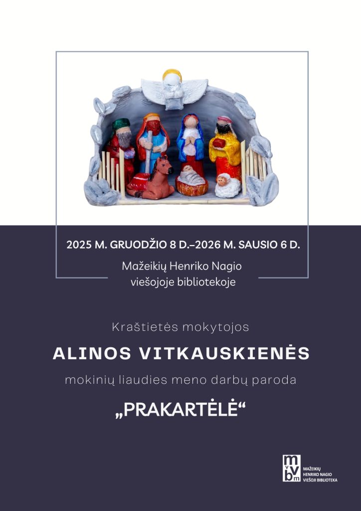 Mažeikių Henriko Nagio viešojoje bibliotekoje pristatomos konkursinėse parodose dalyvavusios mokinių ir mokytojos sukurtos prakartėlės iš natūralių gamtinių medžiagų, keramikos, medžio, tekstilės. Aplankykite parodą. Pamatysite, kaip paprastos gamtos dovanos – kankorėžiai, šakelės, samanos, akmenėliai – gali virsti nuostabiais šventiniais kūriniais, atspindinčiais kūrybiškumą, bendrystę ir Kalėdų dvasią.